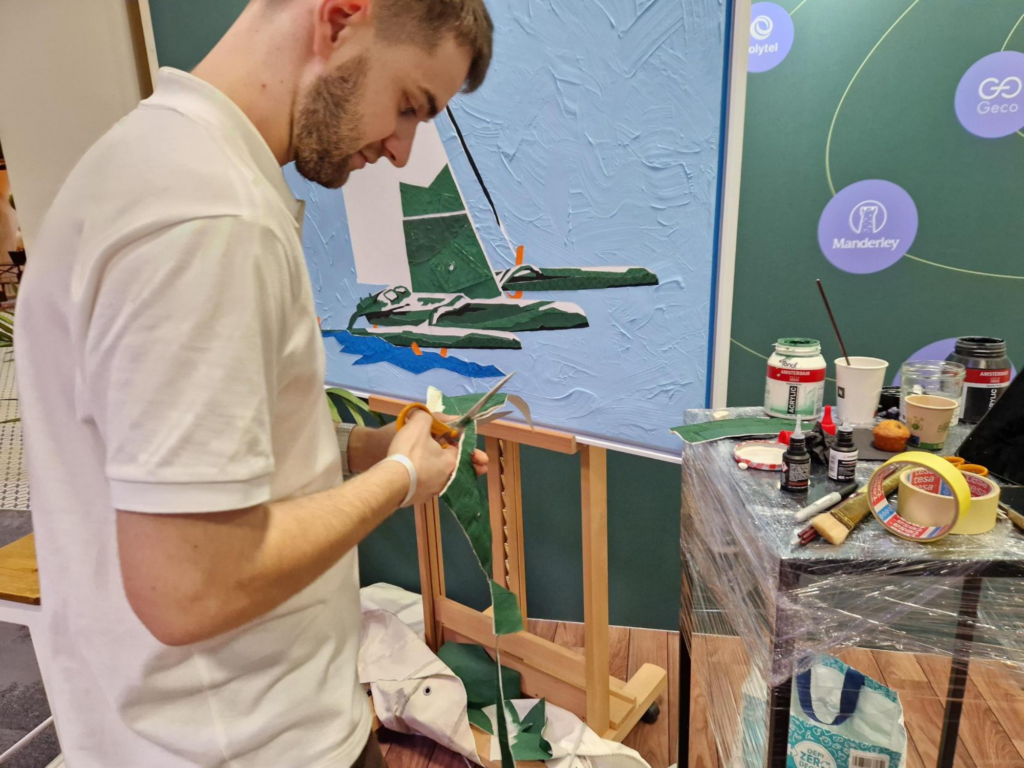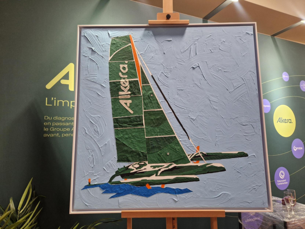 Pour l’AMRAE, il a réalisé ses œuvres essentiellement avec des anciennes voiles afin d’être au plus près du thème de cette édition. Un multicoque aux couleurs du Groupe et des kitesurfeurs ont ainsi été représentés.